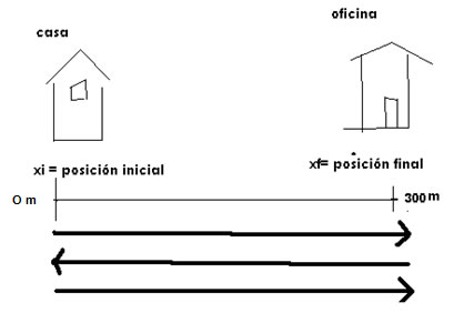 Una persona sale de su casa y camina en trayectoria recta hasta llegar a su trabajo que está a una distancia de 300 metros, se da cuenta que olvido su portafolios por lo cual se regresa a su casa, toma su portafolio y regresa de vuelta a su oficina.
