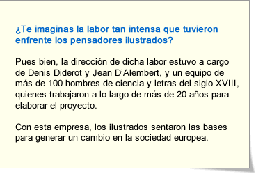 Las ideas de la Ilustración se propagaron a través de una monumental obra: la Enciclopedia o Diccionario razonado de las ciencias, artes y oficios, publicada entre 1751 y 1772. En la Enciclopedia se pretendía hacer una síntesis sistemática y ordenada de todo el saber humano. |